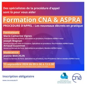 Maître Joseph MAGNAN, avocat spécialiste en procédure d’appel, aura le plaisir de co-animer une formation en présentiel à Paris et en visio dans toute la France sur les impacts concrets des deux derniers Décrets de procédure relatifs à la Procédure d’appel. Attention, la réforme s’applique aux instances introduites depuis le 1er septembre !! N’hésitez pas à vous inscrire à cette formation organisée par la CNA et l’ASPRA !